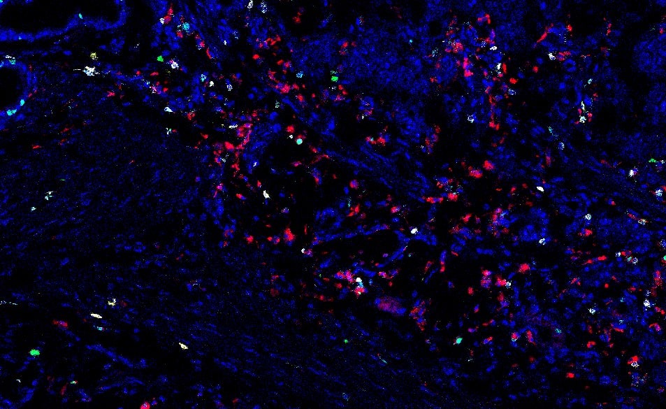 Imaging mass cytometry (IMC) combines antibody-based detection of proteins on tissue with CytTOF® detection. Thanks to the measurement by mass of metal tags cleaved from the antibodies, imaging mass cytometry completely eliminates limitations related to autofluorescence and overlap of emission spectra that come with IF multiplex IHC. This allows for the analysis of up to 37 protein biomarkers per panel.