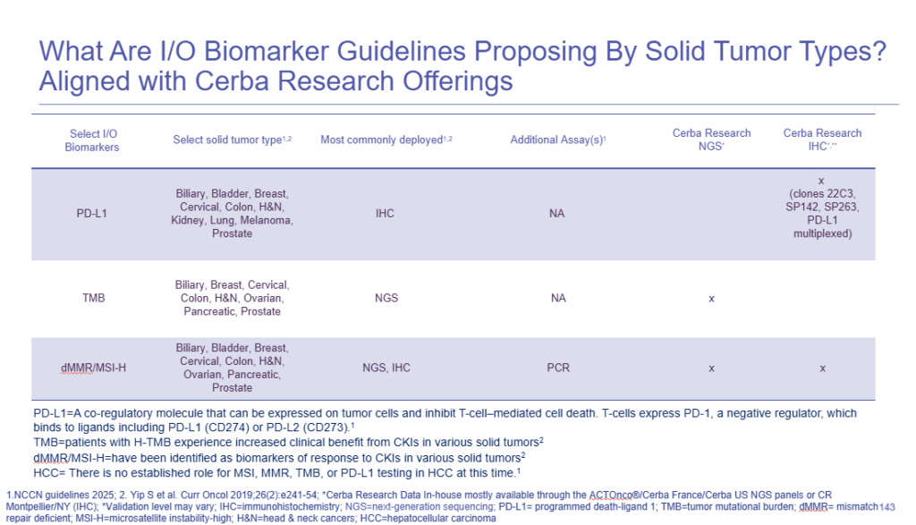 Immunohistochemistry (IHC) is a cost-effective antibody-mediated screening tool that can profile tissue samples and provide both biomarker detection (e.g. PD-L1), immune cell localization, and structural information about the tumor and its microenvironment. Advanced multiplex IHC allows several biomarkers on a single tissue section, maximizing insight from limited samples, which guides patient selection and supports immuno-oncology treatment decisions.