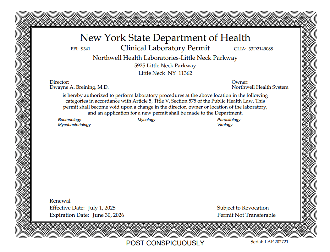 NYSDOH Clinical Laboratory Permit – Little Neck – NY